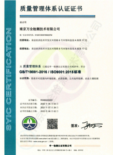 南京萬全檢測技術有限公司,籌建于2013年1月,注冊資金500萬,公司坐落于南京經(jīng)濟技術開發(fā)區(qū)興智路6號興智科技園A棟17層,實驗室占地面積1750余平米。公司是一家獲得省級CMA計量認證資質、具有獨立法人、政府認可的綜合性、專業(yè)性的檢測機構。環(huán)境監(jiān)測業(yè)務是其重要的檢測業(yè)務之一,目前已獲得省級計量資格認可項目314項,設備齊全,具有較強的技術能力。